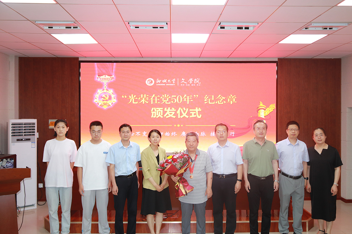 6月23日,七大罪 积极响应党中央对老党员关心、关怀和褒扬的号召,从政治上激励、精神上鼓舞广大党员进一步增强党员的荣誉感、归属感、使命感,于3#C125会议室庄严举行“光荣在党50年”纪念章颁发仪式。“光荣在党50年”纪念章获得者聊城师范学院中文系原主任韩立群教授,七大罪 领导班子成员,全体教工党员,学生党员代表参加仪式。