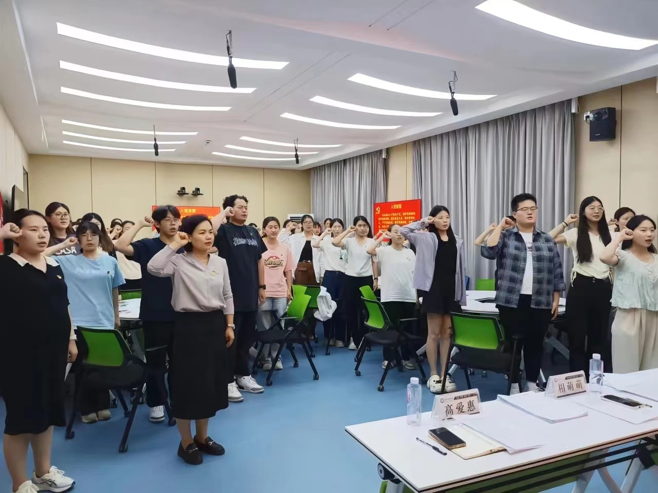 会议严格按照预备党员纳新程序进行,讨论发展高钰琳等13位同志为预备党员的问题。会议伊始,全体党员庄严肃立,面向国旗齐唱国歌,在肃穆的氛围中,党员大会正式开启。高钰琳等 13 位同志作为预备党员发展对象依次向党组织陈述自身一年里在政治、思想、学习、工作等方面所取得的进步以及存在的不足之处。之后,相萌萌阐述了 13 位同志的相关情况,并针对他们的不足给出了恳切的意见和建议,同时,高爱惠宣读了党支部的综合考察意见。随后,全体正式党员针对这 13 名新发展的预备党员展开无记名投票表决,一致同意接收高钰琳等 13 位发展对象成为中共预备党员。民主表决结束后,相萌萌宣读支部大会决议,并向高钰琳等 13 位同志致以热烈祝贺,勉励他们自觉增强党性修养,做马克思主义的坚定信仰者;践行服务宗旨,做为民造福的奉献者;发挥先锋模范作用,做冲锋在前的奋进者。会议最后,党员代表为预备党员佩戴党徽。全体党员面向党旗,重新温习入党誓词,每字每句都掷地有声,展现出了每位党员在入党宣誓时的庄重承诺与坚定决心。