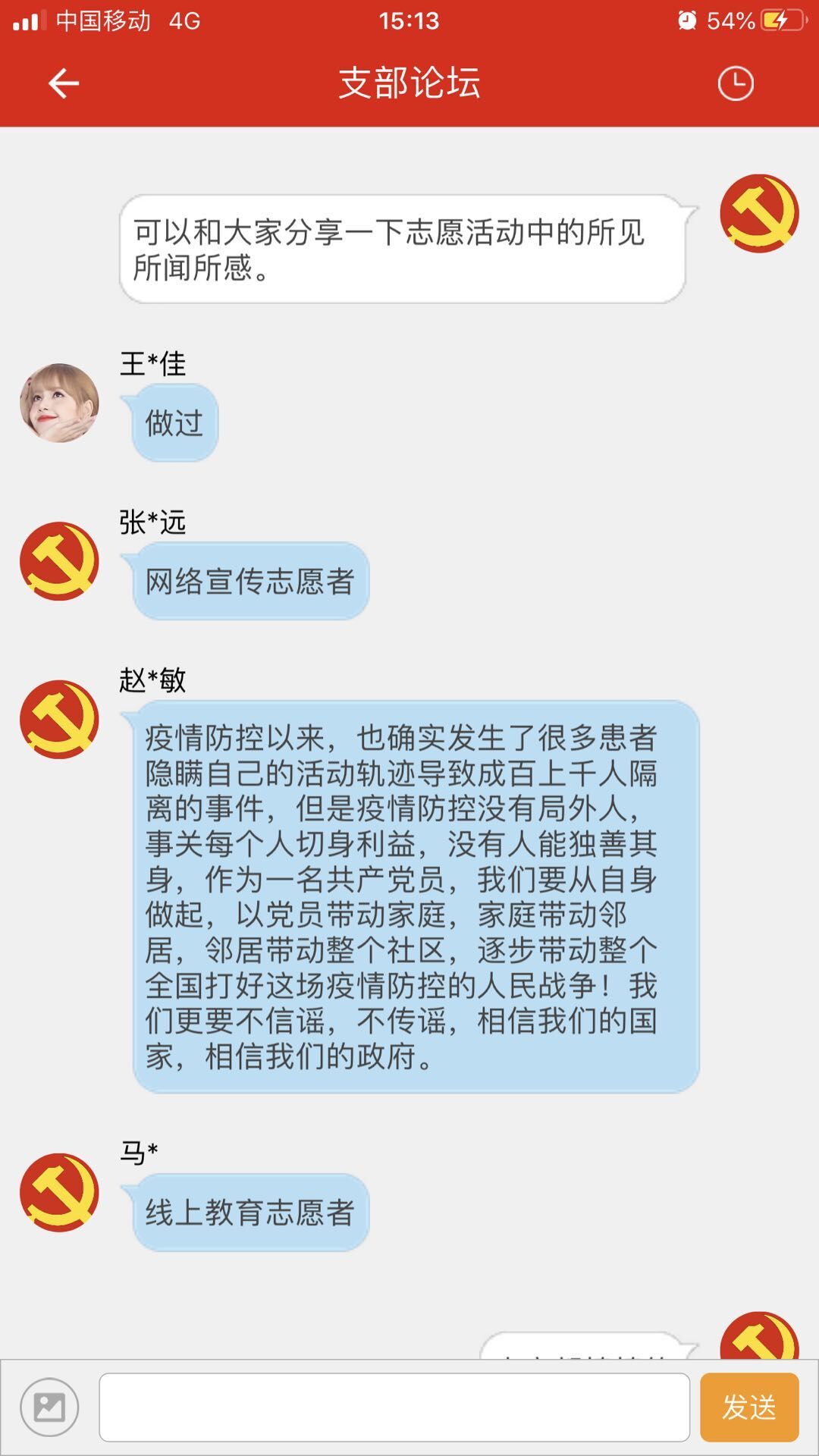 自发布观看任务起,各学生党员积极响应,每日提交心得体会。其中,张同志发布《向先进学习,勇于担当》,苗同志发表《战“疫”我们有中国速度》,杨同志提交《疫情面前,党员在前》等等,各同志在《心得体会》栏目积极发言,发表自己最真实的感想,讲述在疫情期间令自己感动的抗疫事件,写出自己在这次抗疫以及观看视频得到的启示,并在心得体会中明确提出自己在日后必定向抗疫中的党员一样,起先锋模范带头作用。