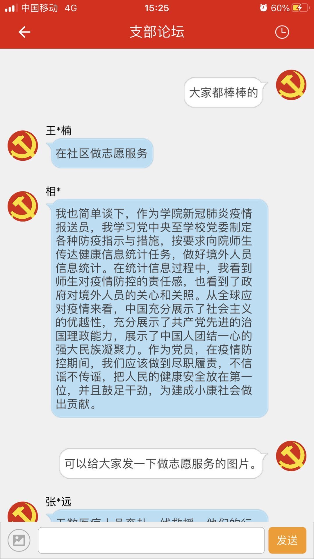 此次论坛开展之前,孙哲通过“灯塔大课堂”组织支部成员进行线上学习,全体成员积极开展学习并记录心得体会。讨论活动开始,孙哲在论坛空间发布讨论的内容以及要求,全体成员积极参与讨论,踊跃发言,大多数同志能够结合自身实际发表自己的看法。相同志作为学院新冠肺炎疫情报送员,他认为作为党员,在疫情防控期间,我们应该做到尽职履责,不信谣不传谣,鼓足干劲,为建成小康社会做出贡献。王同志认为此次疫情更加体现出基层党员干部的重要性,上传下达,党中央的决策部署靠他们落地生根,作为学生党员也要向他们看齐。杨同志认为学生党员及时做好相关宣传非常有必要……支部成员纷纷发表意见,相互交流。大家表示疫情还未结束,作为学生党员我们不应放松学习,要时刻保持清醒的头脑,关注疫情防护的知识,做好党的一面旗帜。