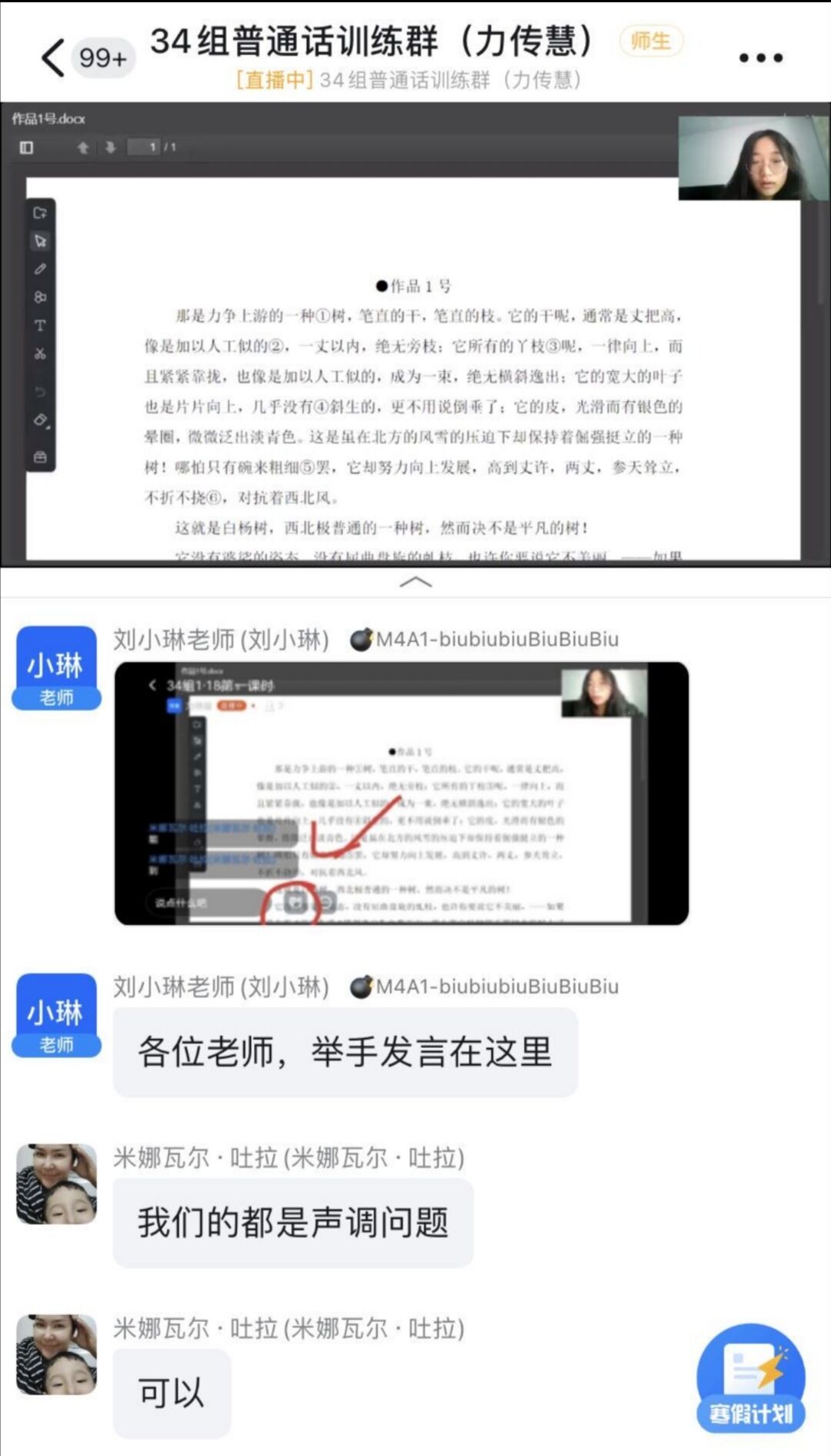 在课程开始之初,助教老师们通过点名、电话提醒的方式保证每一个学员都能参与到课堂中。新疆麦盖提县中小学教师们作为学员在进行自我介绍时简要介绍自己关于普通话的经历和期望达到的学习目标,在拉近彼此距离的同时,助教也对学员们的语音面貌有一个初步了解,为日后针对性的授课打下坚实基础。进入课程的主要阶段,学员对挑选篇目进行朗读,助教在语音、语调方面进行一对一指导,实时纠错,逐字整改。课程结束后,助教布置课后作业,通过录制视频帮助学员巩固所学,并于下午的课程指出问题,帮助学员纠错进步。邢梅萍老师参与到每一组的教学中,记录问题,提出意见,以帮助课堂更好地完成。