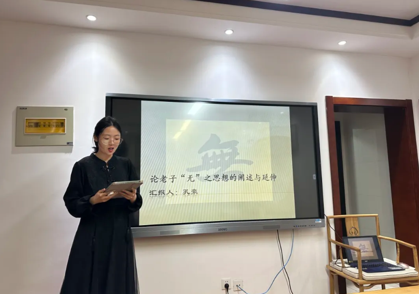 孔豪以“论老子‘无’之思想的阐述与延伸”为题进行汇报。她从三个方面论述了“无”思想对于中国文化的影响,分析了其所包含的哲学价值与现实意义。杨雪锦指出主讲人具备很强的领悟能力和问题意识,论证材料翔实,阐释层层递进。