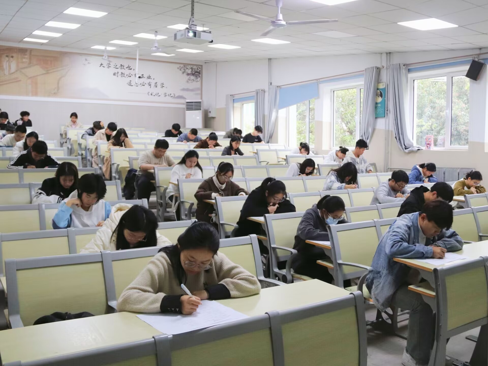本次“传承经典”国学达人系列挑战赛复赛分为两个部分:国学知识竞赛和诗词大会。国学知识竞赛复赛中,参赛者们或眉头紧锁,或奋笔疾书。此次竞赛是对同学们关于国学知识的全面考验,从文化常识的积累到中国传统文化的感悟,参赛者们用自己积累的智慧之匙开启一扇扇通往国学宝库的大门。这里没有喧闹,只有笔尖与纸张摩擦发出的沙沙声,这是对国学热爱的奏鸣,展现参赛者们对国学的深厚情感与扎实素养。诗词大会复赛分为两个阶段:笔试和飞花令。试卷上,从五言绝句到七言律诗,从田园诗到边塞诗,每一道题都是对同学们诗词积累及理解能力的考验。这是知识的比拼,更是对古典文化深切热爱的展现。主持人宣布规则,飞花令即刻展开。第一个关键字“月”揭晓,“春花秋月何时了,往事知多少”率先开口的商学院参赛者字正腔圆,朗读铿锵有力,如行云流水般流畅。“江天一色无纤尘,皎皎空中孤月轮”历史文化与旅游学院参赛者胸有成竹,声音清脆悦耳,仿佛进入诗句所描绘的美好境界中。经过几轮比拼,现场热情高涨,将比赛推入高潮。参赛者们以“花”字为令,佳句频出,“花谢花飞花满天,红香消断有谁怜”“忽如一夜春风来,千树万树梨花开”等脍炙人口的诗句频频闪现。同学们伴随诗句徜徉在文学的海洋里,感受诗歌独有的含蓄与凝练。