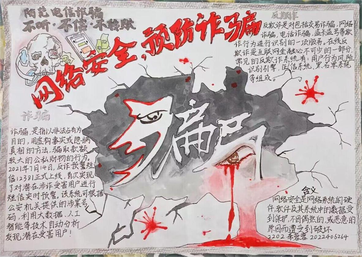 参赛学生用绘制手抄报的方式表达自身对防范诈骗的见解和对维护自身权益的看法。吕佳玉的作品构思新颖,采用“反诈日报”的创新形式,通过简洁的版面和醒目的标题对反诈知识加以强调,以生动风趣的语言引导学生们重视电信骗局。杨荣婷在作品中以金币和互联网为背景,手机屏幕外一只带着手铐紧握钞票的手,象征电信诈骗的诱惑性与危险性,突出展现当今的“互联网+诈骗”的诈骗形式,主题鲜明,设计巧妙,极具讽刺意味。李蓉蓉选用黑色和红色为主色调,凭借精妙的绘画技巧,将诈骗犯丑陋的嘴脸与电信诈骗受害者悔恨的血泪两种形象与“骗局”二字相结合,警示同学们重视网络安全。在张博雅的绘画中,“电话的另一端是鱼钩”的巧思比喻其背后的电信骗局,一则短信领取优惠券购买高额商品最终上当受骗的案例分析,更是反映出电信诈骗在我们生活中无孔不入的现状。