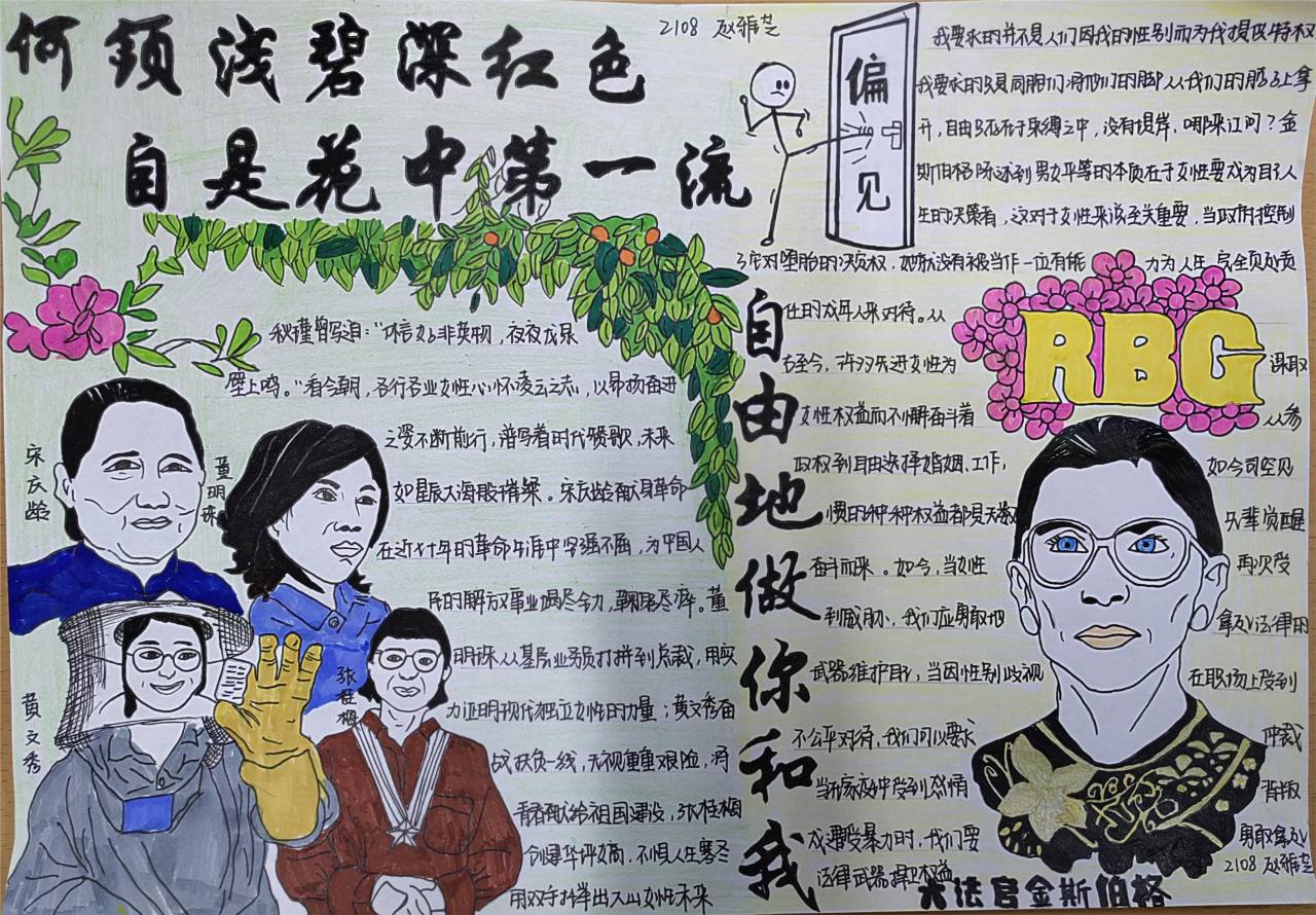 参赛同学以绘制手抄报和海报的方式表达对维护女性权益的看法和对女性力量的理解。谷唯嘉以暖色为主色调,整体布局和谐,内容紧扣主题,不仅绘出了像花一样美好的女性形象,同时列举出女性具有的权益。杨晨的作品内容丰富,紧跟时事,密切关注当今女性面临的困境,左侧版面着眼于介绍女性权益的历史渊源,右侧画面通过搜索框中“女性”关键词与浏览结果中触目惊心的“家庭暴力”、“生育”等热点话题形成鲜明对比。同时,杨晨针对性地提出维权方法,呼吁女性勇敢维护自己的合法权益。“活着的花有千万种开法”,李思语融情于笔,生动形象地传达了“女性可以追求多种多样的美”的思想,以花为主要意象铺满画面,一幅精致的女性画像成为整个作品的点睛之笔。方媛则呼应“看见女性力量”的主题,聚焦于各行各业的女性前辈,在画面中心将“她”字拆分为左右两部分,细致地勾画出多个女性职业形象,不但有平凡的环卫工人和农民,也有敬业的医护人员、警察和学术研究者,蕴含丰富的意义。