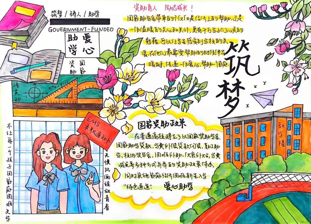 参赛学生以制作书签、手抄报、海报等方式表达自身对国家资助政策的了解和积极进取的人生态度。2022级2班刘奕彤的作品色彩鲜艳,以生动活泼的风格对国家资助加以介绍,通过简洁的版面和醒目的标题引导学生们了解国家资助政策的意义。2022级9班刘巧在作品中以郁金香和两位毕业生为主体,加入红旗、向日葵、玫瑰等元素,通过丰富的画面层次感突出展现“资助伴我行”的主题。2022级10班周思琪的作品紧扣主题,增添书籍与校园的元素充实画面,详细介绍了国家资助政策及其背后意义。2023级1班陈潼的作品构思新颖,采用海报这一创新形式,以温馨的“小王子”为主题反映出国家给予困难学生的温暖,吸引同学们关注国家资助政策,令人耳目一新。