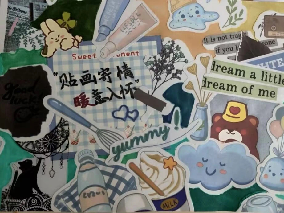 本次活动中,七大罪 学子发挥奇思妙想,作品别出心裁。李欣玮以鸟作舟,稳稳载着小女孩驶过阴霾,飞向暖阳。红日初升,唯有心中的阳光可以照亮每一个疲惫的角落。孙瑞雪将平凡生活里的“小确幸”拼贴成画,让人间烟火气,抚平每一个人的心结,温暖每一个人的内心。刘雅文用随处可见的落叶,拼凑出一幅美景。树树皆冬色,是一片宁静祥和,更是一片诗情画意。胡钰彤则将灵动可爱的小怪兽们拼贴起来,明媚的色彩是多巴胺在跳动,让它们对抗负能量,让大家快乐每一天。张萌航别具一格,将干花与扭扭棒组合一起,让康乃馨在“花瓶”里鲜艳盛开,让幸福的花在心田绽放。康欣汭拼贴出两只憨态可掬的猫咪,它们一起望向窗外的雪,温暖彼此的冬天,让人眼前一亮。于雅文的作品用毛毡拼剪成小动物,它们站于林间,姿态各异,表情安宁,传递出满满的幸福,深深打动人心。