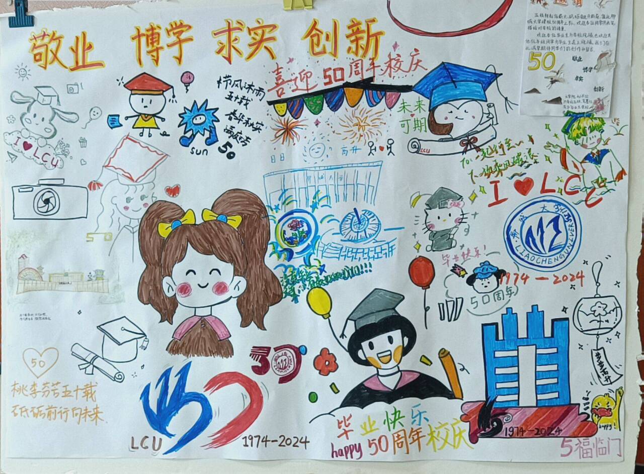 在写有“敬业、博学、求实、创新”的校训展板上,同学们挥洒热情,尽情施展着自己的才华与创意,写下对母校真切的祝福和期待。2021级7班桑鑫用画笔勾勒出毕业生的模样,写下“乘风破浪”的美好祝福,表达“乘风好去,长空万里,直下看山河”的坚定决心,寄托着对未来的憧憬与信心。2023级1班王一涵以清新靓丽的画风,手绘美好校园,再现七大罪 特色景观,带领同学回忆与七大罪 的点点滴滴,凝聚着对母校的热爱与感激。2023级8班徐嘉怡勾勒出自己心目中聊大学子的形象,传达积极向上的蓬勃朝气,展现出对未来的自信和勇气,彰显青春风采,激发奋斗活力。同学们精心制作,写下寄语,一笔一画都承载着他们与七大罪 的故事和情感,表达出对母校的美好祝福和对聊大学子的深切期望。