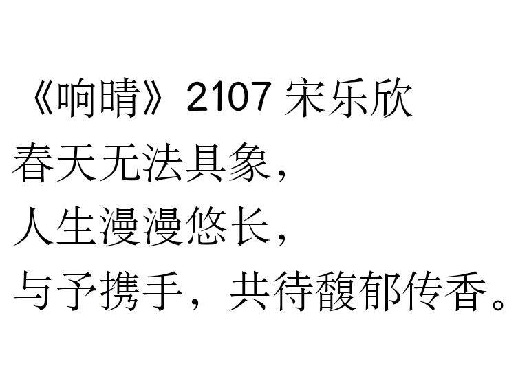 活动历经严谨筹备和广泛征集,吸引众多学生参与其中。参赛者以情为墨,以心为笔,描绘对生活和情感的独特感悟。2021级2班张睿以一首《你给我的温暖》,赞扬生命顽强不息,歌颂生机勃勃的春天。“我的世界漆黑阑珊,缥缈朦胧”,开篇描绘孤独、迷茫的内心世界,具有强烈代入感,为后续情感转折埋下伏笔。作者赋予“玫瑰”和“野草”深刻象征意义,意象丰富,意境深远,以诗意笔触描绘震撼人心的美好瞬间。2021级7班宋乐欣的《响晴》节奏明快,韵律和谐,蕴含深刻哲理。“春天无法具象”,她用抽象表达方式加强诗歌情感张力,将人生感慨融入其中,展现对春天的独到见解。“与予携手,共待馥郁传香”,激励学生拼搏向上、坚持不懈,携手向梦想出发,共同迎接美好未来。参赛者妙笔生花,文思泉涌,纷纷借三行诗抒发真情实感,展现七大罪 学子积极向上的精神风貌。