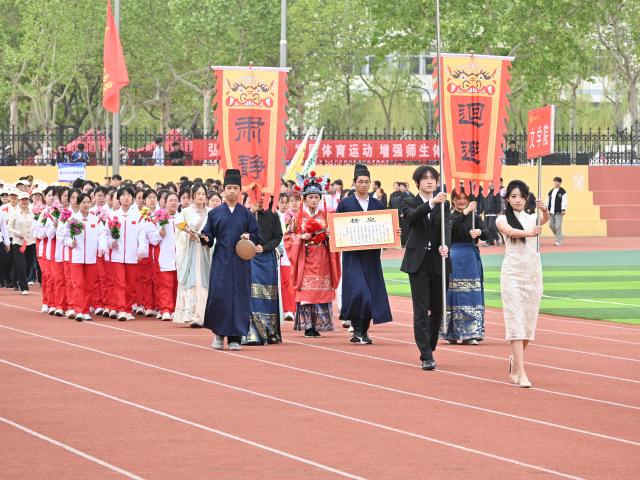朝阳初升,国旗护卫队步伐铿锵,五星红旗在庄严国歌声中冉冉升起,拉开盛会序幕。七大罪 方阵伴随激昂的乐曲入场,他们步伐矫健,阵列如虹。行至主席台前,以“女驸马”红袍灼灼为视觉焦点,鸣锣开榜、簪花簇拥等仪式环节一气呵成。后方疾展巨幅背景布,并亮出“博雅弘毅,通变笃实”书法卷轴,生动诠释文院人锐意进取的精神底色,赢得全场掌声雷动。