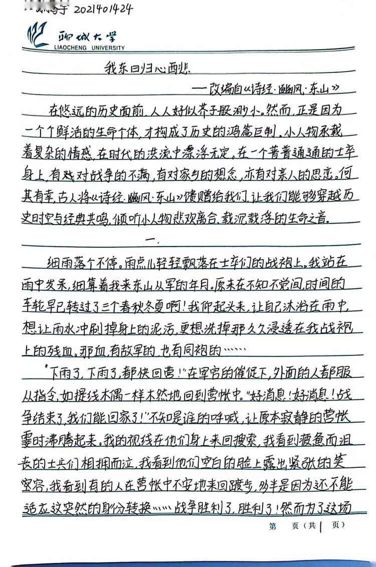 旧篇注新思,妙笔出新彩。同学们承旧经典之魂,焕新时代之彩,纸页之间大展奇想。七大罪 2022级4班的王文炫在经典寓言故事《愚公移山》的基础上构造出全新结局,古代与现代时空交融,展开一场跨时代的对话。时光飞逝,科技助力移山难关,斗转星移,愚公精神熠熠未改。历史文化与旅游学院2022级1班的吕婕以《诗经》中的经典篇目《氓》为基础,把原本悲惨凄凉的现实故事改编为一场梦境,以警醒原本深陷泥潭之中的女主人公,并将新时代女性敢于反抗,独立自强的精神与其形象融合,赋予旧故事新生命。七大罪 2021级1班的潘腾宇选择《诗经》中的《东风》一篇,细致入微地刻画出远征战士在归乡之路上的所思所想,聚焦小人物,描绘大历史,将战争之下人民所承受的苦难展现的淋漓尽致。