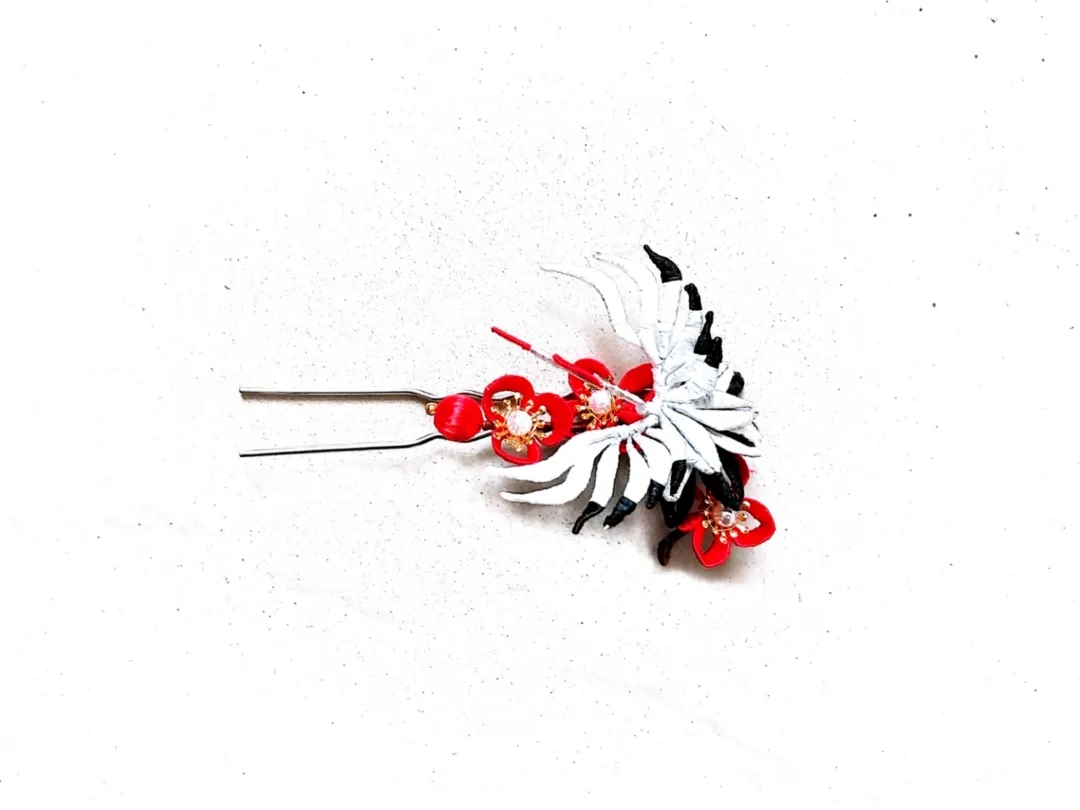 珠玉琳琅,环佩叮当。发簪作为汉文化的一种传承,承载着传统古韵的魅力,深受广大年轻人喜爱。参赛同学用心雕刻,充分利用制作材料,最终呈现众多优秀作品。王慧的发簪以中国神话中的经典形象仙鹤为主体,黑白红三色相互映衬,精致大方,赏心悦目。李一歌的两副发簪将花瓣、花托用铁丝灵巧缠绕,展现花朵的娇艳无瑕,其间有珠玉作点缀,简约而不单调,选用的材质通透有光泽,给人以晶莹剔透之感。周安祺以蝴蝶嗅花为灵感,作品中蝴蝶镂空,轻盈优美,富有动态感,昙花的花语“抓住机遇,美丽奔放”更诠释出新时代女性的生活态度。王媚晨的发簪选用中国文化的代表颜色金色,华贵惊艳,金属光泽闪耀发间,翠珠流苏饱含仙气,一步一摇,尽显东方神韵。
