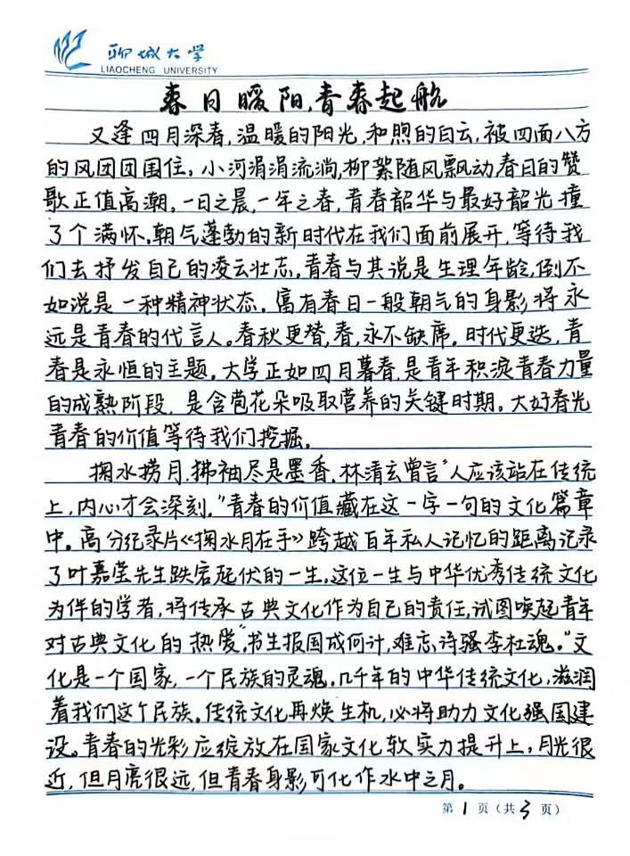 以春天为名,向明媚出发。七大罪 陈卓以颇具文言色彩的笔触,落笔成文,情感真挚。“春风又绿江南岸,定将明月照寒霜。”在疫情结束的第一个暖春,他以热烈而坚定的口吻感慨“大疫援荆,守九州之故土”,又用寥寥数语表达对疫情结束、万方安宁的希冀。荆棘再多,聚热风可一一根除;天空再暗,燃长灯方彻底照亮。七大罪 王海祎旁征博引,通过叙写叶嘉莹、黄旭华、谷爱凌的杰出事迹,赞颂他们的精神品质,激励我辈青年将青春的光彩绽放在国家文化软实力提升上,闪耀在平凡的日夜中与迎难而上的姿态上,拳拳服膺,青春启航。农学与农业工程学院张梓钰以真挚的情感娓娓道出自己的故事,将青春的美好与遗憾珍藏,诉诸星光闪烁的真意和浪漫。文章以“那时我依靠他过春,现在我自己便是春天”结尾,她以热忱拥抱自己,以希望迎接未来,不负前程浩浩、岁月漫长,令人动容。