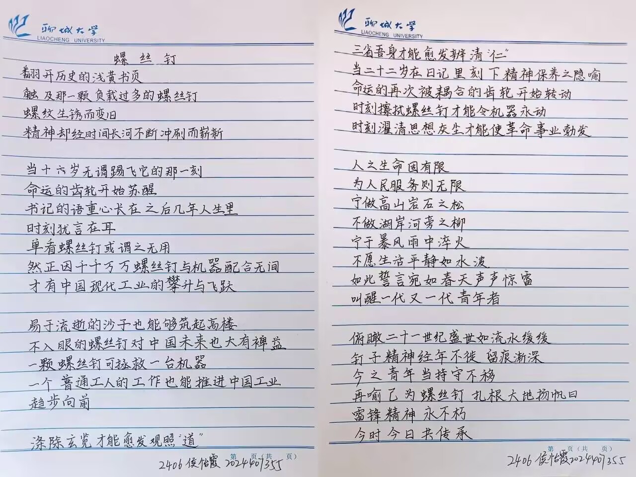 2022级7班王新佳以鲜明的色彩碰撞诠释主题,画中“学雷锋 树新风”六字遒劲有力,与华表、党徽等元素交相辉映,辅以振翅飞鸽与绽放繁花,既显庄重又添生机,传递出新时代青年勇担使命的昂扬姿态。2023级3班陈瑞涵则以黑白水墨见长,通过简洁的线条勾勒出雷锋坚毅的军人形象,背景如一卷无声诗篇,将平凡岗位中的坚守演绎得淋漓尽致。2023级6班李梦君聚焦雷锋日记精髓,以细腻笔触再现其短暂而璀璨的一生,呼吁青年赓续“为人民服务”的精神血脉。2024级6班侯怡霞匠心独运,以“螺丝钉”为意象串联历史与当下,锈迹斑驳的零件与“十六岁命运转折”的诗句形成张力,展现精神传承的永恒力量,而诗中“宁做高山岩石之松”的誓言掷地有声,激励青年如螺丝钉般扎根时代浪潮,在奉献中书写青春。