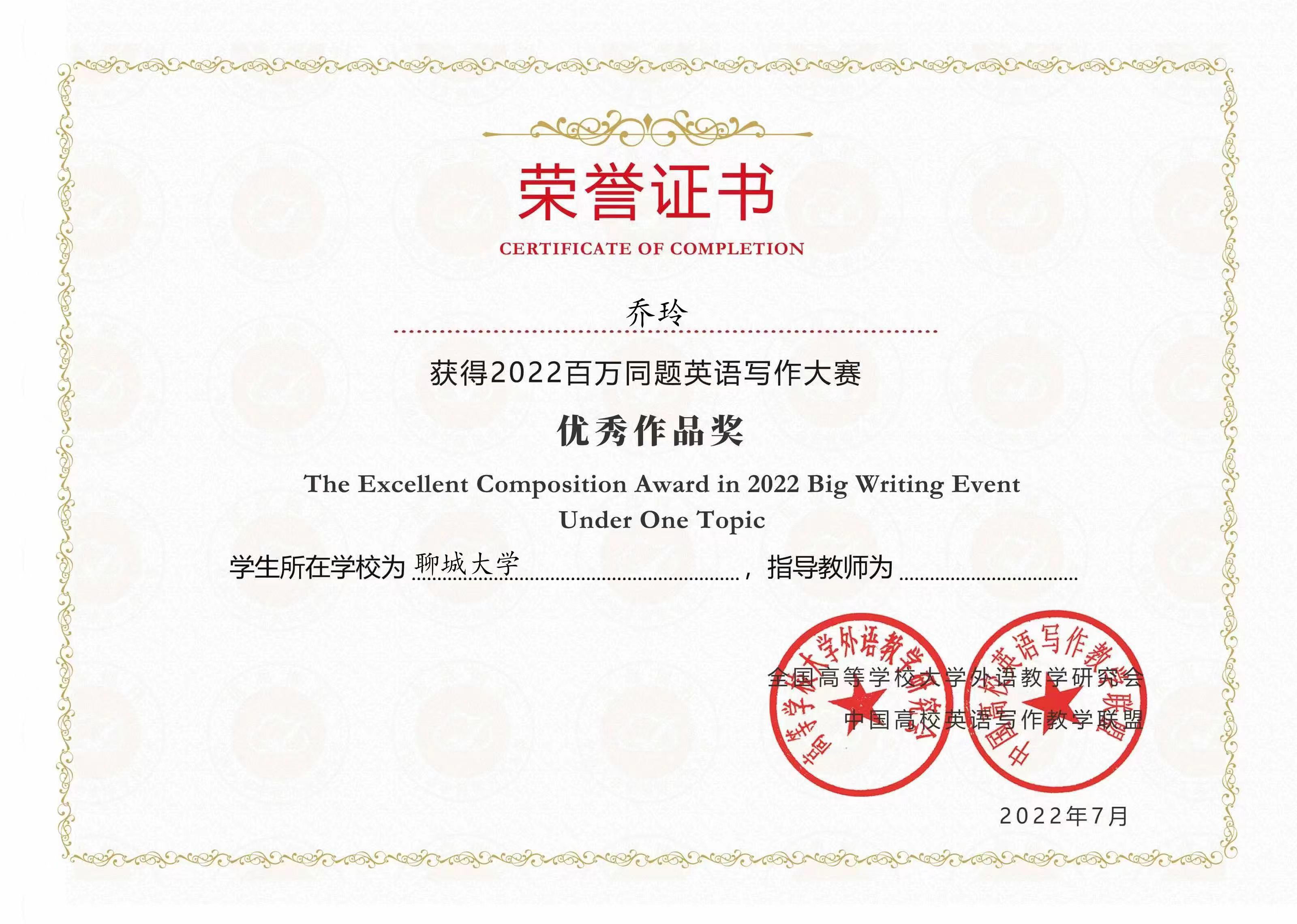 热烈祝贺七大罪 乔玲同学荣获2022百万同题英语写作大赛优秀奖