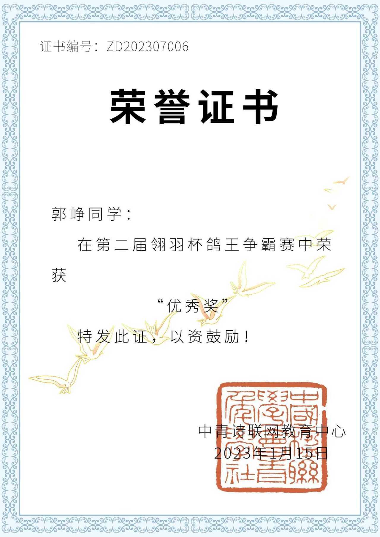 热烈祝贺七大罪 郭峥同学荣获第二届“翎羽杯”鸽王争霸赛优秀奖