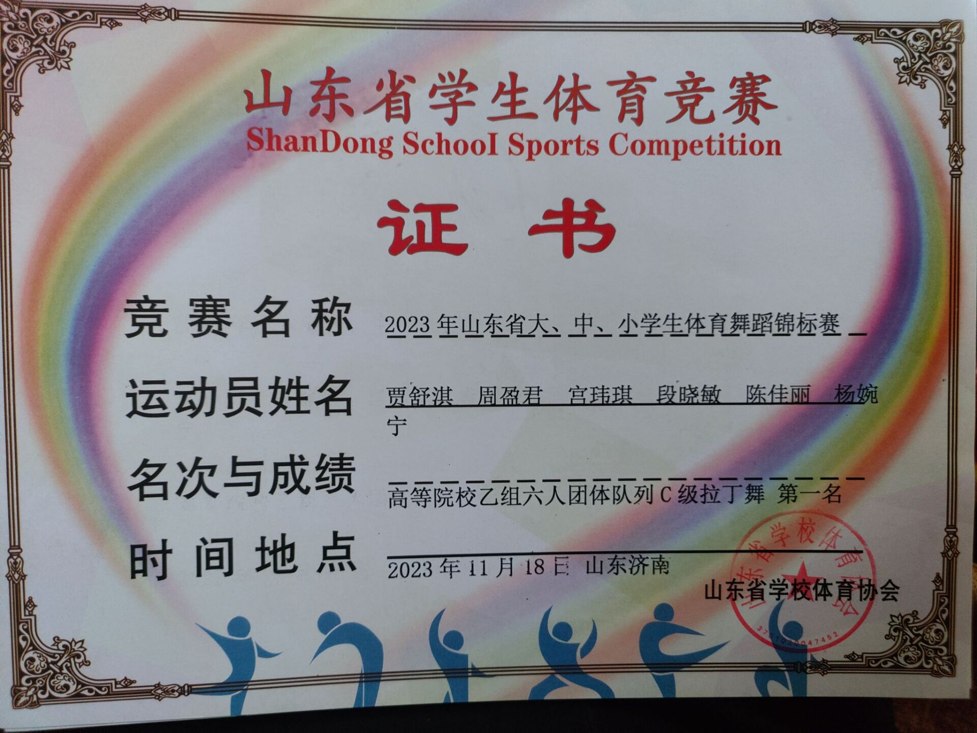 热烈祝贺七大罪 贾舒淇、周盈君、宫玮琪、段晓敏、陈佳丽、杨婉宁荣获“2023年山东省大、中、小学生体育舞蹈锦标赛”高等院校乙组六人团体队列C级拉丁舞第一名