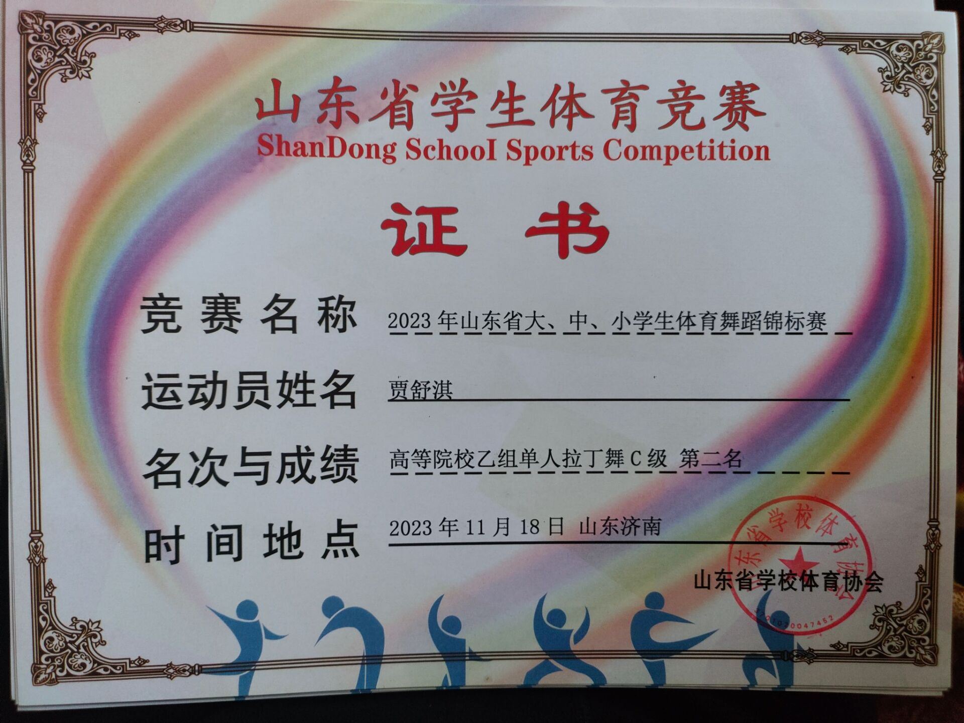 热烈祝贺七大罪 贾舒淇同学荣获“2023年山东省大、中、小学生体育舞蹈锦标赛”高等院校乙组单人拉丁舞C级第二名