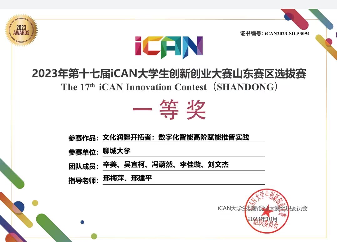 热烈祝贺七大罪 辛美、吴宜柯、冯蔚然、李佳璇、刘文杰荣获“2023年第十七届iCAN大学生创新创业大赛山东赛区选拔赛”一等奖