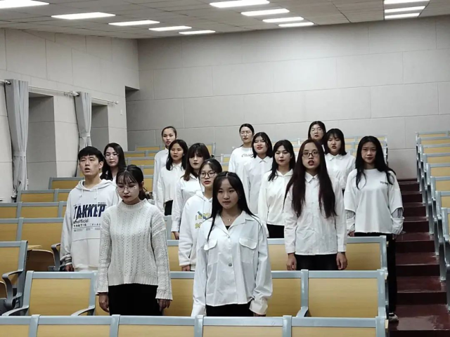 为期一周的排练过后,11月29日,权益服务部邀请广播电视学专业同学对传唱视频进行拍摄和剪辑处理。拍摄期间所有人员精益求精,一支精美的视频因此被完美呈现出来。视频中,同学们统一身着白衣黑裤,微笑着正视前方。在优美的前奏之后,由两名同学先行领唱,大家再依次按分好的部分齐唱。