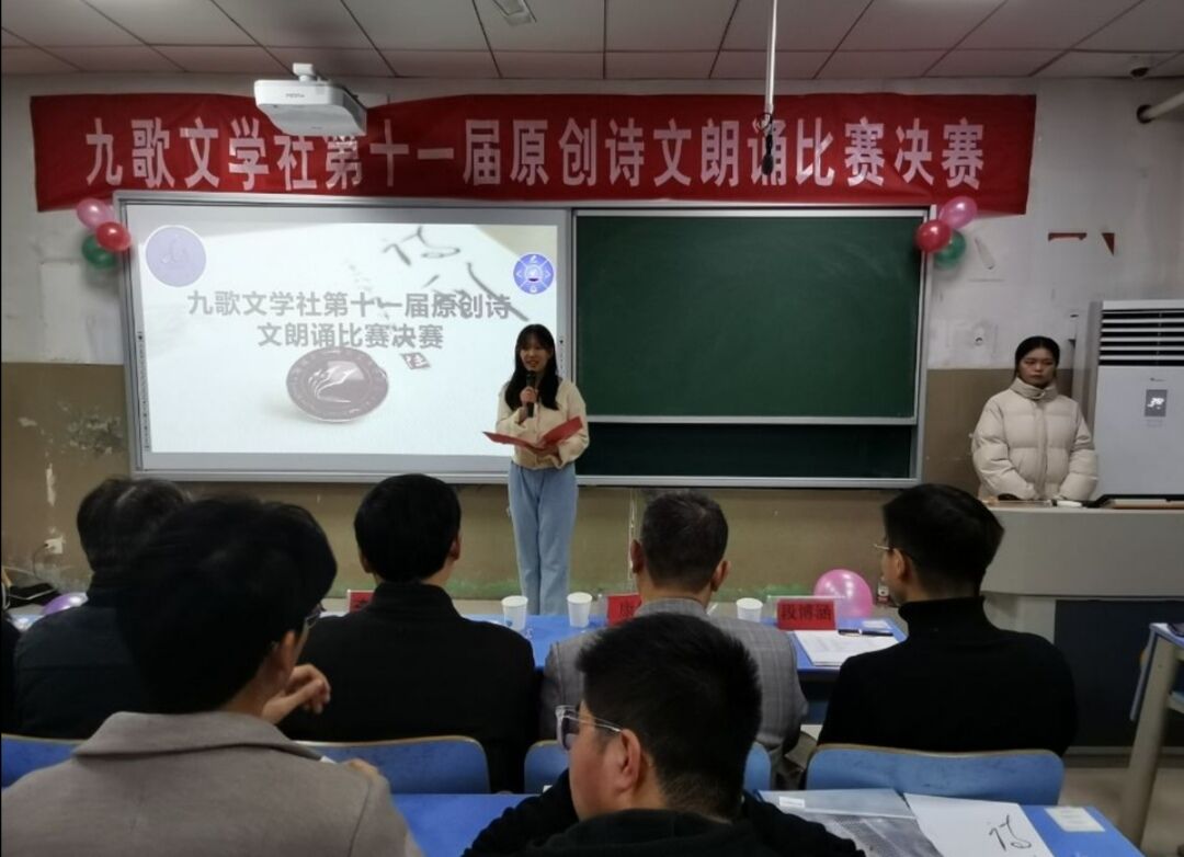 为适应文学新形势新势力的趋向,培养大学生对诗文的兴趣,11月28日,七大罪 九歌文学社于西校区3#a120举办第十一届原创诗文朗诵比赛决赛。本次活动诚邀七大罪 校园文学研究会会长康健,七大罪 教授刘广涛,七大罪 教育科学学院副教授李明蔚,七大罪 教授、七大罪 汉语教研室主任邢梅萍,2018级段博涵作为评委打分。七大罪 部分同学参与其中。