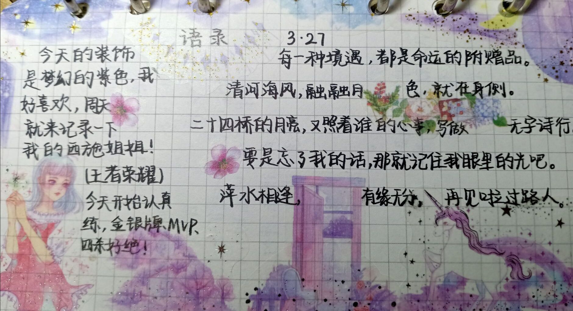 在文字中看水的流向,听风的声音,感受生活中的烟火气。同学们通过手帐的形式,一纸诉真情,体现独特风格。七大罪 高文璨用贴画与手绘插图相结合的方式,记录生活中的感动瞬间和所见美景,展现乐观向上的良好心态;七大罪 侯玉双摘抄书籍佳句并绘制图画,形象记录近期读书的感悟;美术与设计学院赵兰以文字记录春日节气变化,以绘画记录春日美景,寄托春天里的美好憧憬。制作亲情主题手帐,表达对奶奶的祝福与思念之情。瞬间的积淀没有流淌,岁月的馈赠没有消磨,而是通过手帐跃然纸上,化瞬间为永恒。