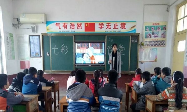 志愿者到达目的地后,按照组别分别进入二年级、五年级教室。两班学生在各自志愿者的带领下齐诵《弟子规》,邵志浩用生动活泼的小故事使孩子们积极踊跃的参与其中。课间活动期间,孩子们将志愿者团团围住,与志愿者聊天、你一言我一语,并将亲手折成的小船、爱心等手工品送给志愿者。接着,志愿者分组表演以“父母呼,应勿缓;父母命,行勿懒”为主题的情景剧,让孩子们在游戏中学习孝悌之义。最后,志愿者带领孩子们进行“你画我猜”游戏,孩子们的机智回答让志愿者们连连称赞。