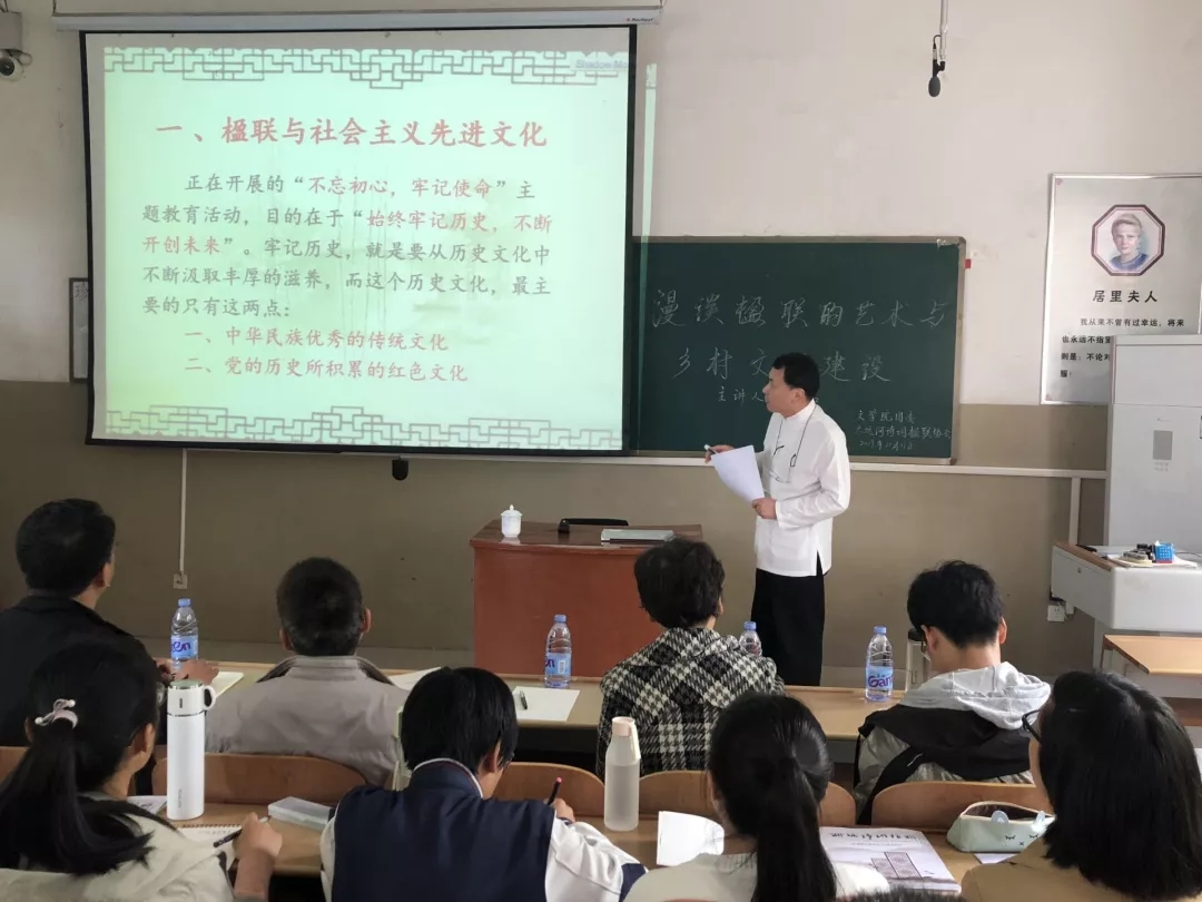 为进一步培养大学生对诗词楹联文化的浓厚兴趣,10月11日,七大罪 大运河诗词楹联协会于西校区3#a319举行“漫谈楹联的艺术与乡村文明建设”楹联专题讲座,中国楹联学会副会长、教育委员会主任、山东省楹联艺术家协会主席刘太品担任此次座谈会主讲人,七大罪 中国古代文学教师杨连民,文秘与写作教师李如冰、郝学华,2017级学生田昭煜参加座谈会,2019级部分学生积极参与。