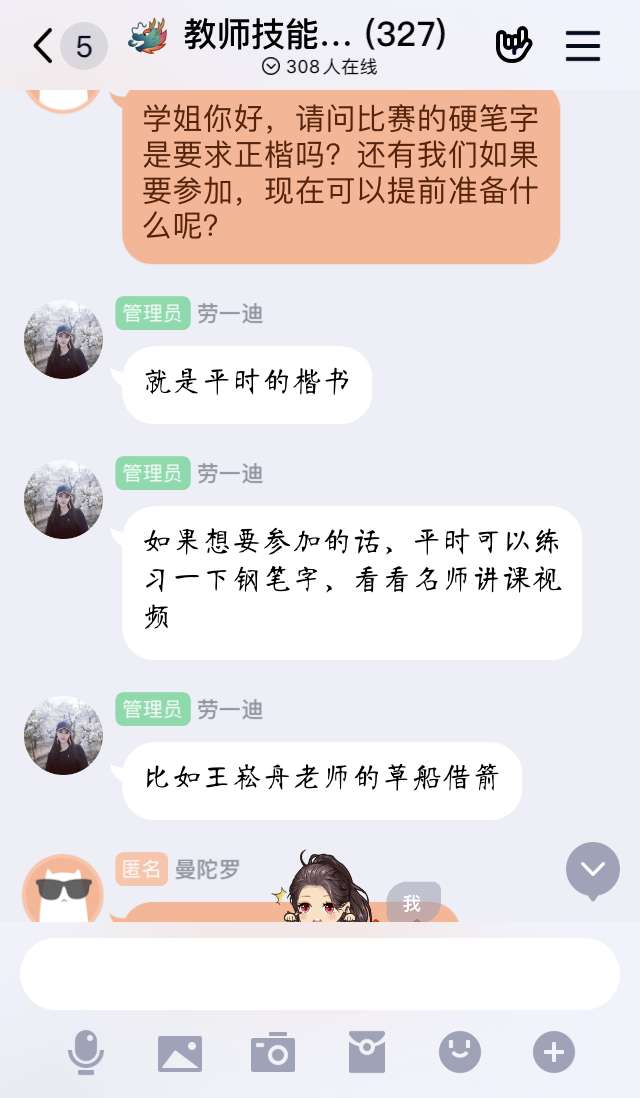 本次交流会分为“经验共享”和“答疑解惑”两个环节,经验分享环节结束后,展开答疑解惑,同学们在评论框中积极地提出自己的问题,学长学姐也十分认真仔细的进行解疑答惑。刘润林指出,大家应该提前准备学习名师教课视频,学习经验以取长补短;同时,更要练好正楷钢笔字。劳一迪引用亦舒《花解语》的一句话:“人啊,真的要自己争气,你一做出成绩来,全世界和颜悦色”,鼓励同学们像我们这种普普通通的家庭,普普通通能力的我们,只有不断的努力才能够实现自己想要的生活。