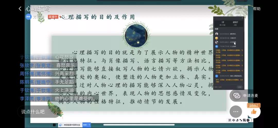 本次PPT制作比赛的开展是为网上支教活动做准备,并以“增强学生的作文心理描写能力” 为主题,其中20186班吴鑫凤的作品结构严谨,用幽默风趣的语言概括知识,并且选取三个典型的视频进行举例,作品最终被选为第二期网上支教活动的授课课件。有过第一期网上支教的经验,此次网上支教的老师们讲课更加熟练。20191班刘雨荷、逄鹤对知识点进行详细讲解,将知识点与事例充分结合,使小学生牢记知识点;完整的课堂离不开学生与老师的交流,20191班马新儒采用连麦的形式实时听取小学生的问题并予以解答,而谭晓彤则通过提问的方法帮助小学生扎实记忆学习内容,在一问一答中收获写作技巧;小学生具有无限的想象力,2019级5班方雨晴便抓住这一点,鼓励小学生大胆想象,用天马行空的想象点缀作文。下课铃声响起,小学生们向老师们表达对下一次上课的期待,老师们也用名言警句激励他们努力学习。