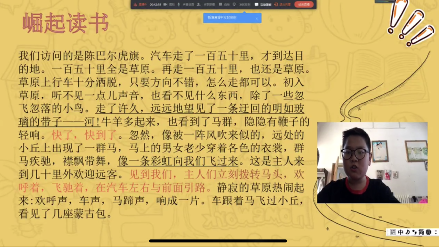 本次讲课的内容是以景物描写为核心的作文课,几位老师都用自己特有的方式为小学生们答疑解惑,并留下深刻的印象。20182班的唐天云以其诙谐幽默的语言风格吸引着小学生们专心上课,在收获作文知识之余也了解到许多文学趣事,于学习中感悟喜悦;大家对于展示自我非常积极,在20185班胡雪婷和20195班方雨晴的课上就有两位同学多次主动与老师连麦,声情并茂的朗读课文,向老师提出自己的疑惑,两位老师也由浅入深、循序渐进的为他们解答问题;小孩子是最有想象力的,20191班刘雨荷在讲解“比喻、拟人”的修辞手法时鼓励同学们活学活用,其中张祥燕所说的“静夜中,只有那天上的星星窃窃私语”意境幽美,得到老师和同学的称赞。本次网上支教不仅是老师给学生传道业,更是朋友之间的友好交流,响起的下课铃带来的不是结束,而是浓浓的不舍。