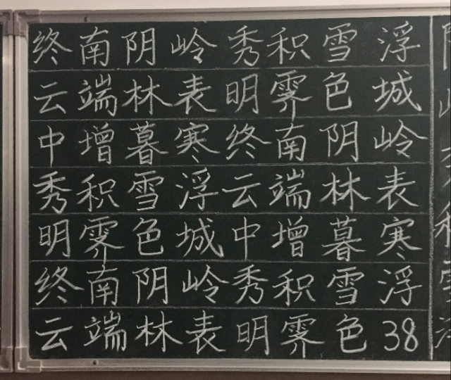 本次比赛以班级为单位进行初赛,从中推选出作品优秀的同学进入决赛。比赛采用现场板书的形式进行,板书内容统一,选自唐代诗人祖咏的《终南望余雪》:“终南阴岭秀,积雪浮云端。林表明霁色,城中增暮寒。”冬日恰逢暮寒,别是一番滋味,此情此景,此诗此意,相辅相成。比赛开始指令发出后,同学们站在各自的黑板位置前笔走龙蛇,他们目光专注地注视板面,灵动的手指写下一个个娟秀灵动的字,落笔如云烟,观其力而不失,身姿展而不夸,笔迹行云流水,给人以美的享受,在一笔一划的书写中感受作为人民教师应当必备的责任与担当。在所有同学书写完成后,老师对作品进行专业打分,分别评出一二三等奖。王晓君的书法行云流水、气势磅礴;翁文倩的字体娟秀端庄、流美疏朗;臧亚男的作品鸢飘风泊、灵动优美。书到深处见文化,书到极致见精神。每位参赛选手都以一丝不苟的态度纵横在撇、捺之时,行走于横、竖之间。老师们认真仔细地筛选参赛作品,最后评选出优秀作品一等奖10名,二等奖20名,三等奖24名,并将获奖名单公示。