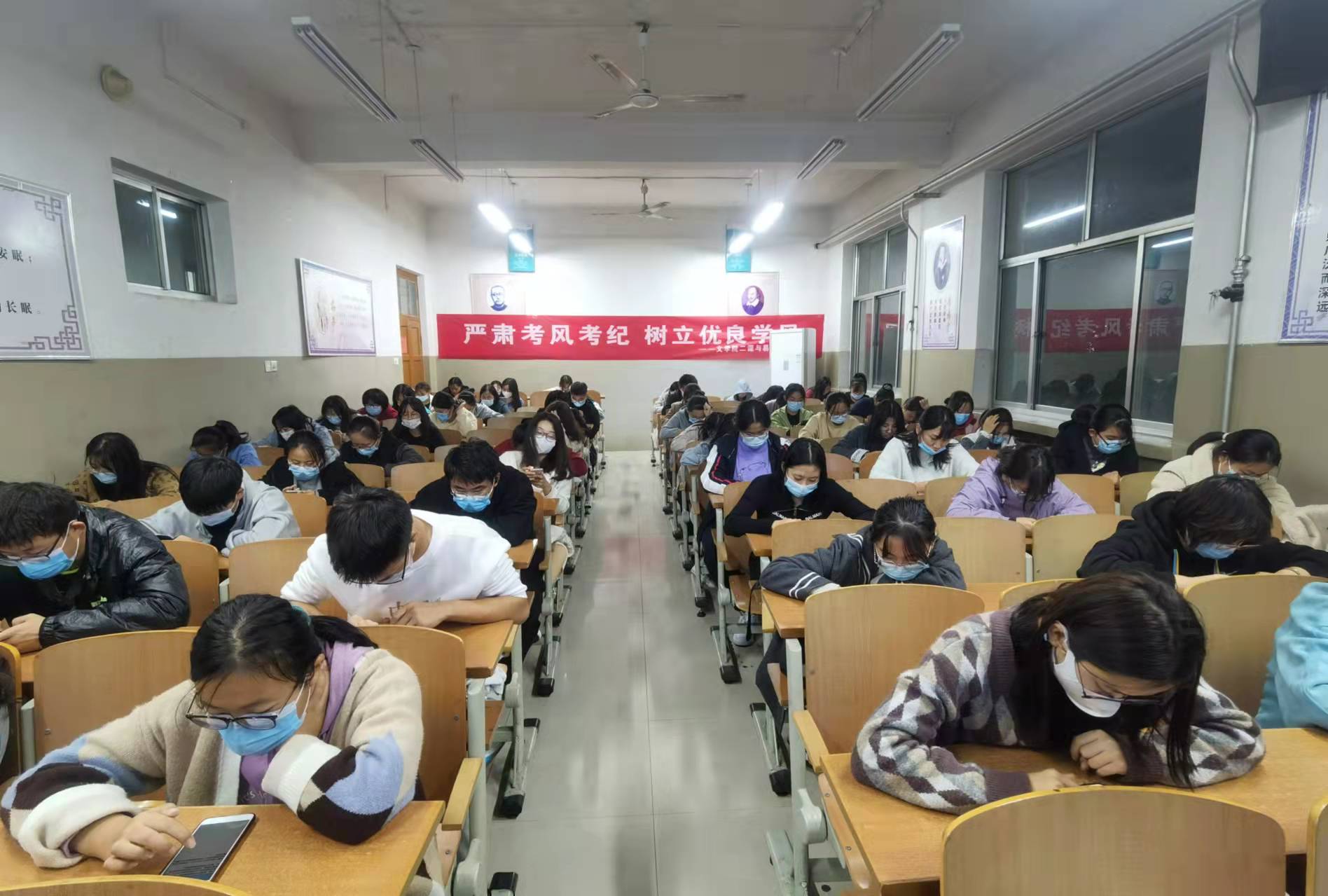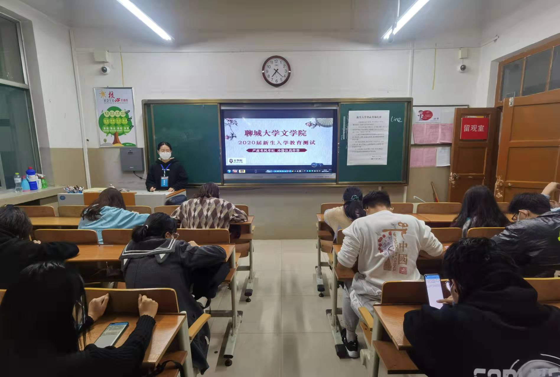考试过程中严格按照疫情防控要求间隔就坐,考试之前胡玥老师对同学们进行疏导,预祝同学们考试成功。各班监考人员认真负责,督促同学们严格遵守考场规则,严明考场纪律。整场考试进行中同学们低头认真答题、态度端正、纪律良好。秦梦琦、李昕等同学巡视各班考试情况,认真检查考场情况。