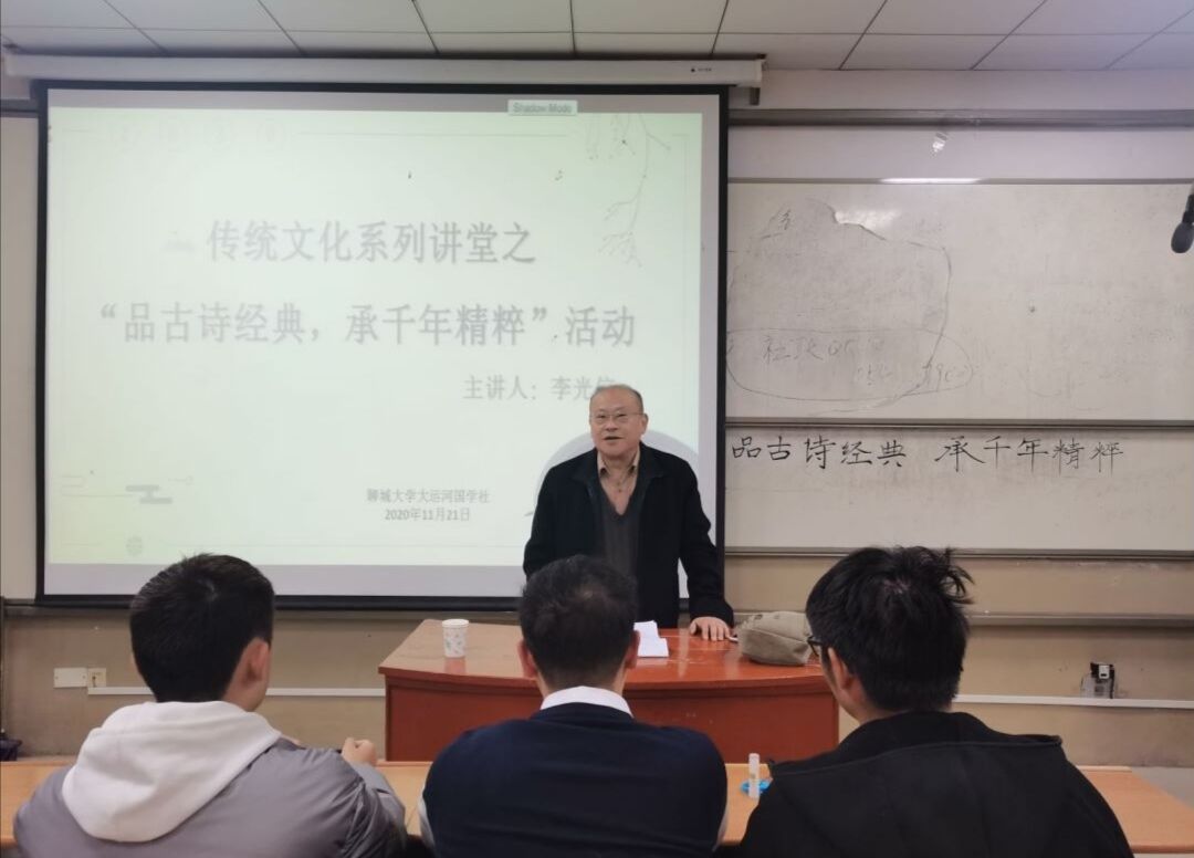 诗词尽显古典情,邀你共赏诗意心。活动伊始,李光信运用具体的例子对“诗是什么这一问题进行详细的阐述,他讲解道:“诗从广义讲是一切艺术的统称,是人类关照世界和把握世界的方式;从狭义上讲是中国近代以前一直被奉为文学正宗的那种文体”随后,李光信围绕“诗与社会生活”这一主题,提出“诗歌文学来源于社会生活,又反映社会生活的观点,并用人们熟知的例子进行解释。同学们情绪高涨,积极地参与互动。随即,他又从诗的立意出发,强调赋诗言志最重要的就是“新”。活动最后,李光信带领同学们一起品鉴诗的语言,共同感悟诗歌语言的三个基本特征。