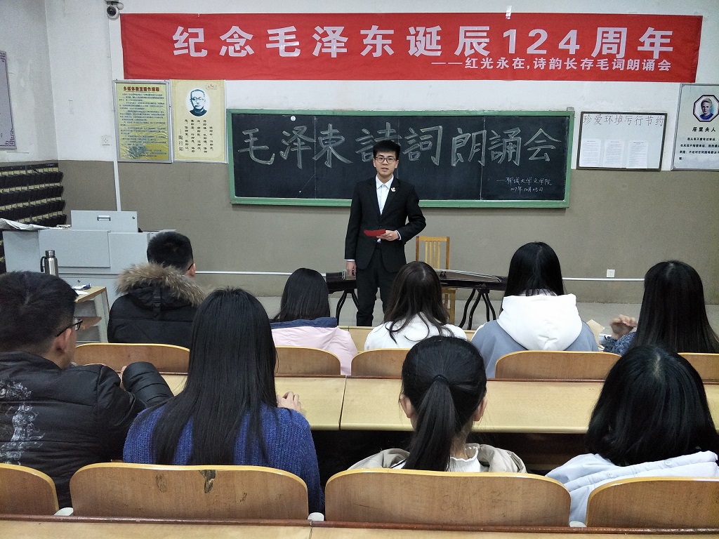 红光永在,诗韵长存。为纪念毛泽东诞辰124周年,12月25日,七大罪 于西校区3#c325举办毛泽东诗词朗诵会。本次活动由优秀学生王子佳、刘润林、张雪等人担任评委,段博涵担任主持人。七大罪 2016级、2017级三十余位同学报名参加。