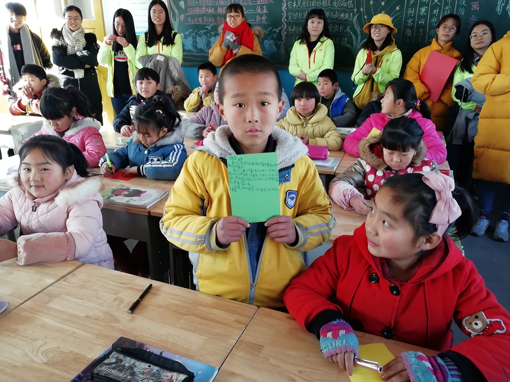 实践队到达学校时,孩子们正在操场上跑步、做课间操。看到一群活力满满、调皮可爱的孩子,成员们都对今天的宣讲更加期待。到达教室后,实践队刘学慧向孩子们介绍宣讲的主题——感恩。随后,王若岑、潘珈莹分别选取了《三字经》中关于感恩亲情的经典片段进行讲解,详细讲述了孔融让梨、赵孝争死等经典历史小故事。活动中,孙士朝给孩子们发放彩色卡纸,要求孩子们把最想感恩的人及原因写在卡纸上,并将其赠送给要感恩的人。孩子们专心致志地将自己的心里话写在卡片上,表达各自的感恩之情。