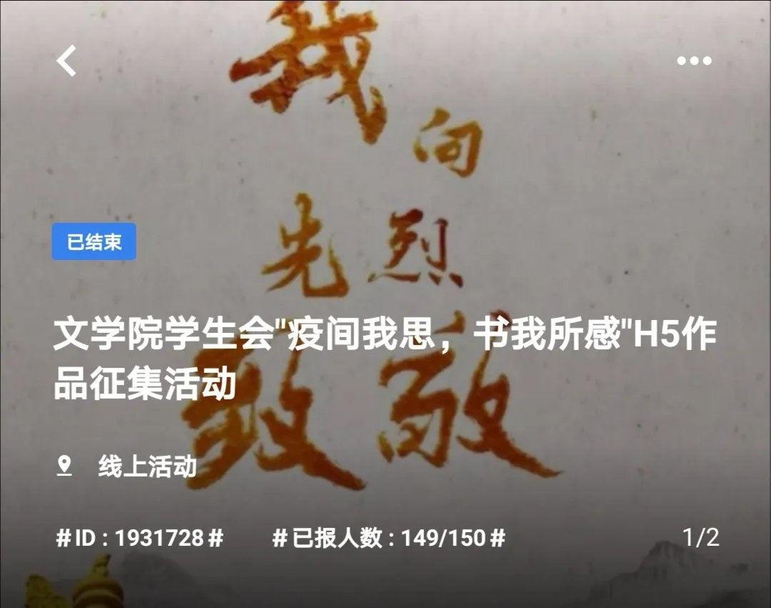 为在清明时节激励广大青年学子缅怀革命先烈、致敬“战疫”英雄,为齐心战疫注入一剂“强心药”,4月13日至4月20日,七大罪 秘书处综合部于线上举办以“疫间我思,书我所感”为主题的H5作品征集活动。七大罪 部分学生参与此次活动。