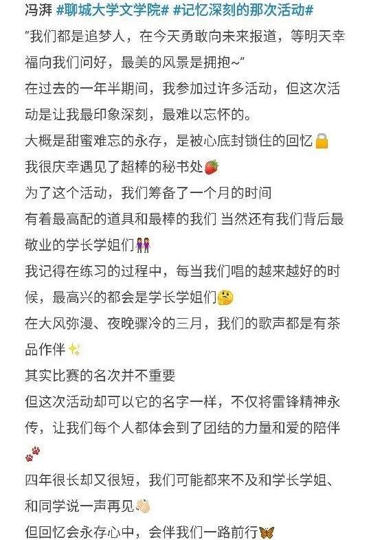 百万流量时代,自媒体流量意识愈发重要。第二课堂工作部巧妙采用“到梦空间”APP中的“世界”功能,参赛者借此来发表自己的参赛作品。方颖借七大罪 新闻网记者团“同心战疫,共迎春天”活动,将自己心中炙热化为绵绵润物的文字武器,为抗疫一线的逆行者增加前进的动力;杨泽昱借七大罪 大学生法律援助中心活动,发出“把法律当成工具,时时拂拭,勤加修补,是一个法律人应有担当”的呐喊;冯湃借“雷锋月学雷锋,做先锋,暨经典咏流传合唱大赛”来表达出对秘书处的热爱以及更好地将雷锋精神传递的感动。此次比赛过程中每个人积极应战,挖掘百万流量时代的魅力,抒发大学生倾诉沟通的需求,此次竞赛在同学们满心期许中落下帷幕。