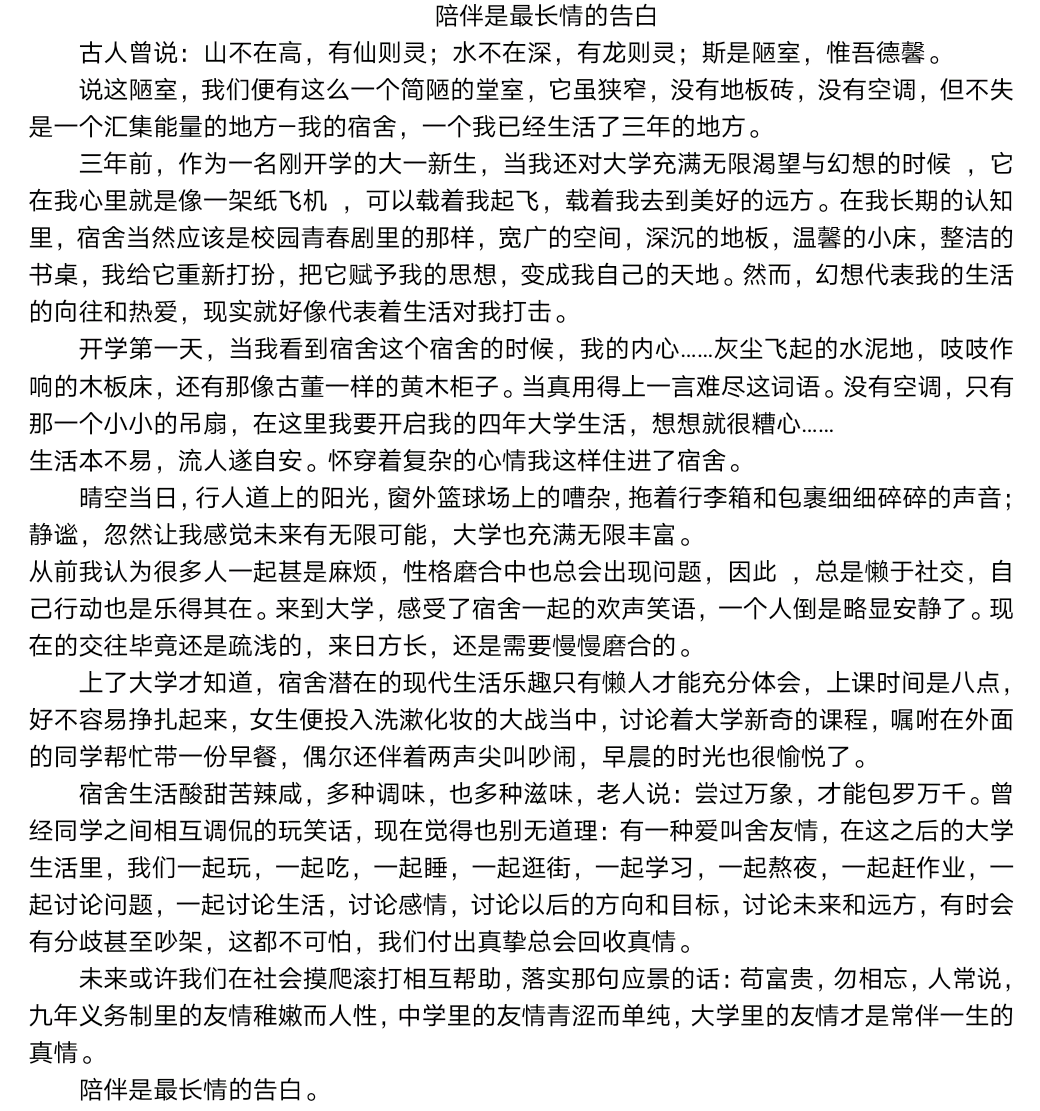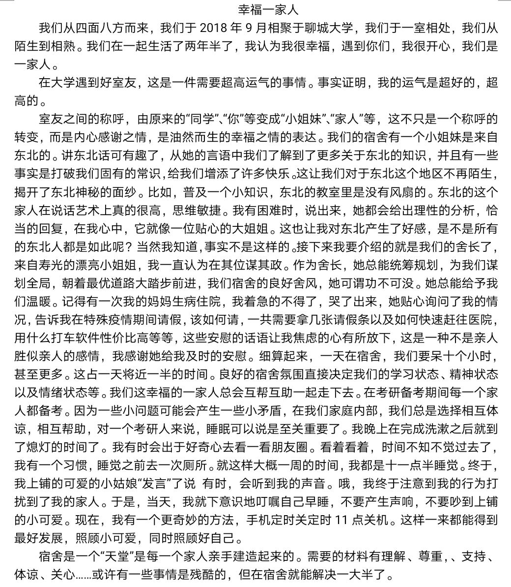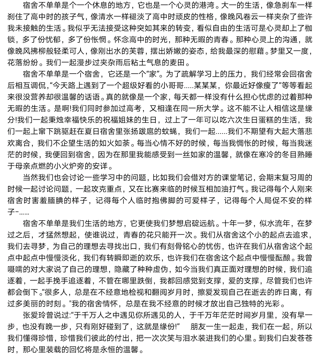 天南海北聚一处,宿舍情谊也成歌。“舟舟独立敢当,阿娇聪慧机灵,阿辉温柔体贴,晶晶闯实自主,小芹可爱热心”,2018级3班冯新宇在征文中描绘出五个性格鲜明的舍友;2020级5班丁新月写下与舍友们一起准备团体比赛、绘制公益海报和参加五四诗会等难忘的回忆,从陌生到熟悉,从害羞青涩到现在的携手并肩;2020级7班王可欣回忆起生病时舍友无微不至的照顾,考试时的互相激励,旅行时的美好喜悦,让人体会到舍友间的深厚情谊;九月观白露,十月幸相逢,2019级8班刘德悦笔下的518宿舍是一个温暖的避风港,是温馨的小家,怀揣着希望与力量。