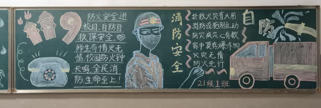 活动前期,同学们认真准备,分组讨论,细致耐心地完成组内黑板报。学习发展部志愿者仔细筛选板报成品,评选出具有代表性的作品。2021级2班同学在其黑板报作品中用拟人的绘画方式表现出“119”的可爱形象,配文言简意赅,巧妙突出消防安全的板报主题;2021级11班的黑板报作品灵活地使用“葫芦娃”的漫画形象,提醒同学们遭遇火灾时随时注意安全。2021级3班黑板报作品整洁大方,字体工整,罗列多条消防安全知识,进一步加深同学们对消防安全知识的理解与认识。2021级6班黑板报作品整体布局和谐美观,注重强调森林火灾预防的重要性。此外,还有许多形式多样、生动有趣的黑板报优秀作品。