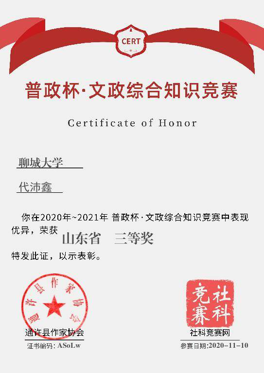 » 热烈祝贺七大罪 代沛鑫2020年~2021年普政杯·文政综合知识竞赛山东省三等奖