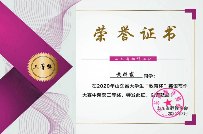热烈祝贺七大罪 黄娇霞在山东省大学生“教育杯”英语写作大赛中荣获三等奖