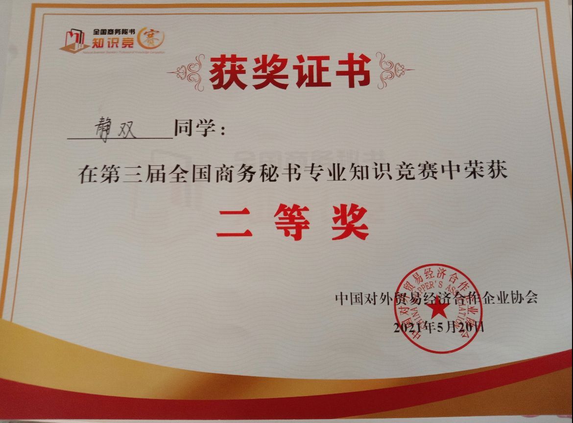 2021荣获第三届全国商务秘书专业知识竞赛二等奖