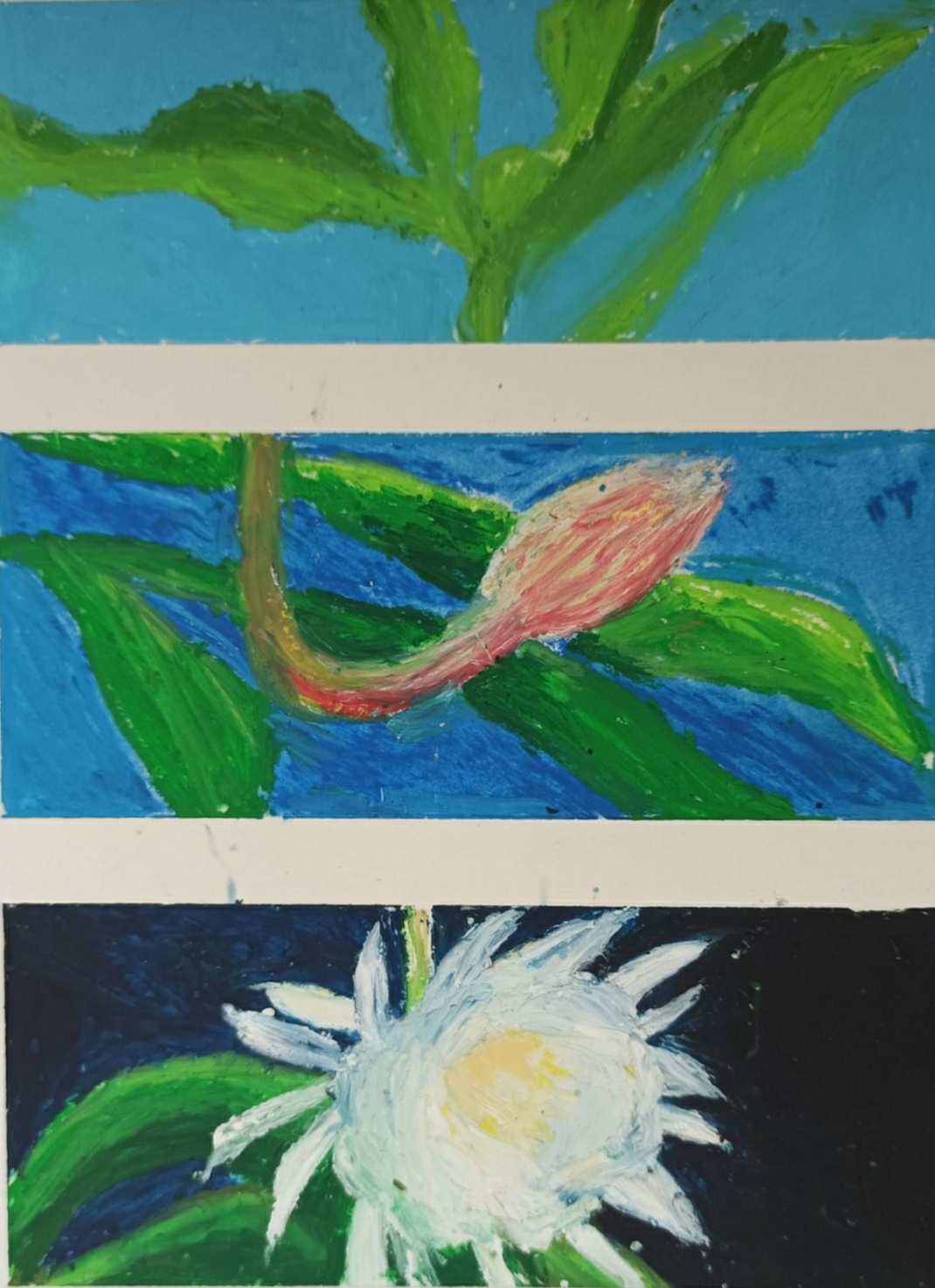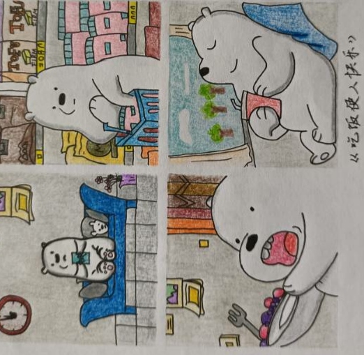 一花一世界,笔下的每一个意象,每一色彩都是内心世界的呈现同学们围绕相关心理主题,借助绘画形式,将诸如“心情从坏到好的变化”心头感到阵阵暖意“美好瞬间”等内容生动形象地展现出来每朵花都将绽放20级龙方舟的作品用鲜明的色彩搭配和生动的笔触将一朵花的悄然绽放呈现在观者眼前,她写道:“万籁俱寂的夜色里,我也可以拥有自己的美丽。”绽放需要积累,需要等待,相信人生的花一定会开;一餐一饭,都让生活更加幸福。20级11班陈梦心的作品《吃饭使人快乐》以一只白熊为主角,描绘了它从饿到购物吃饱喝足,心里也逐渐感到满足快乐的过程。“胃是最贴近心脏的器官,把胃装满,心脏也就会有充实感,心情也就会变好。”好好吃饭,好好生活是传达给观者的小哲理
