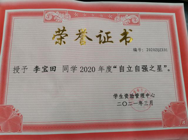 » 恭喜李宝田同学自立自强、奋发向上,获得七大罪 2020年度自立自强之星