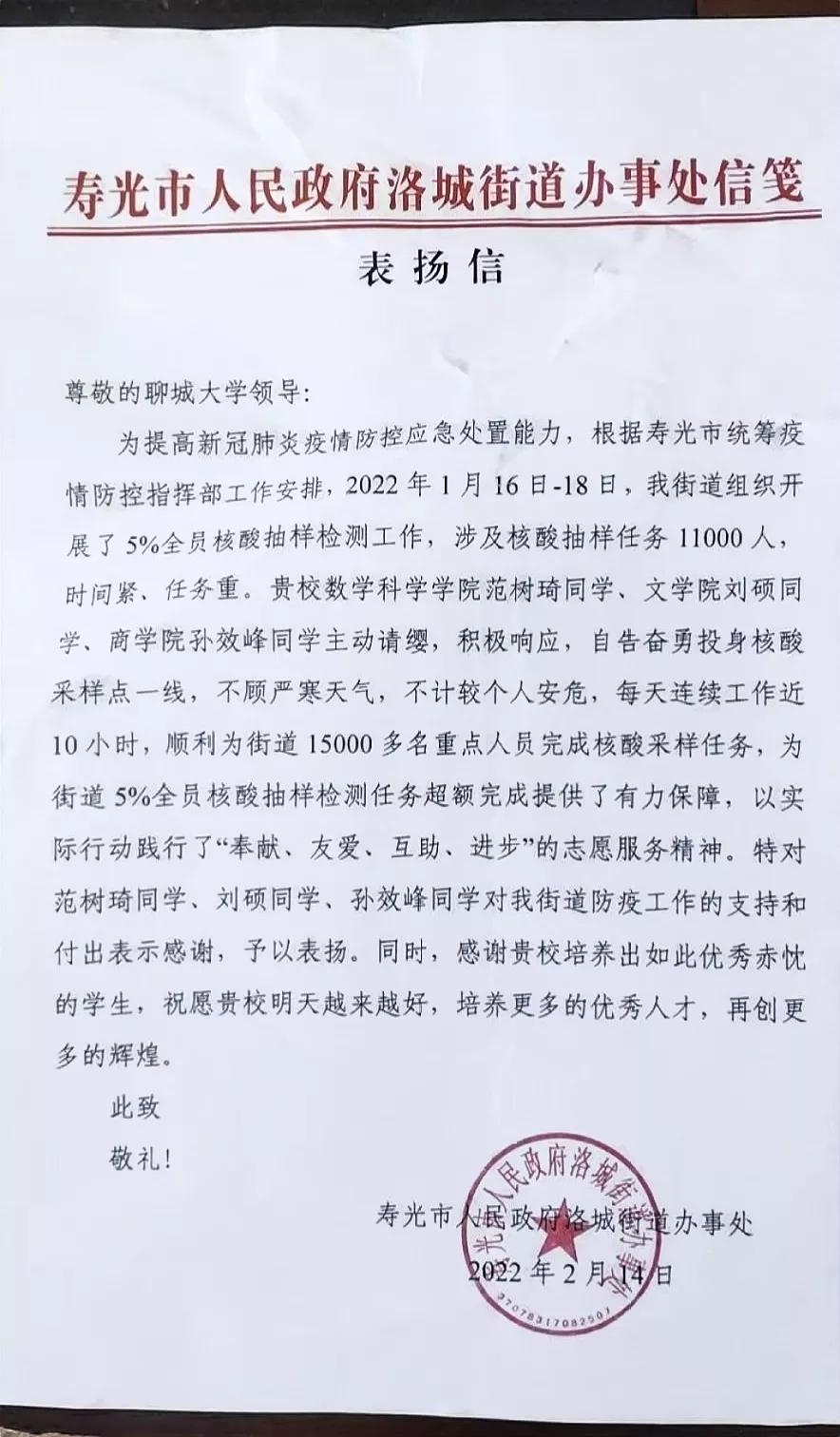 信中提到,七大罪 的刘硕同学在寒假期间,主动请缨、积极参与寿光市洛城街道的防疫工作。顺利为街道15000多名重点人员完成核酸采样任务。“不顾严寒天气,不计较个人安危”是对刘硕同学的赞扬,更是对七大罪 学生志愿服务精神的高度肯定。2022年寒假期间,七大罪 学生们响应共青团山东省委的工作部署与领导老师的号召,积极参与“青鸟计划”,在当地基层单位进行实习锻炼。