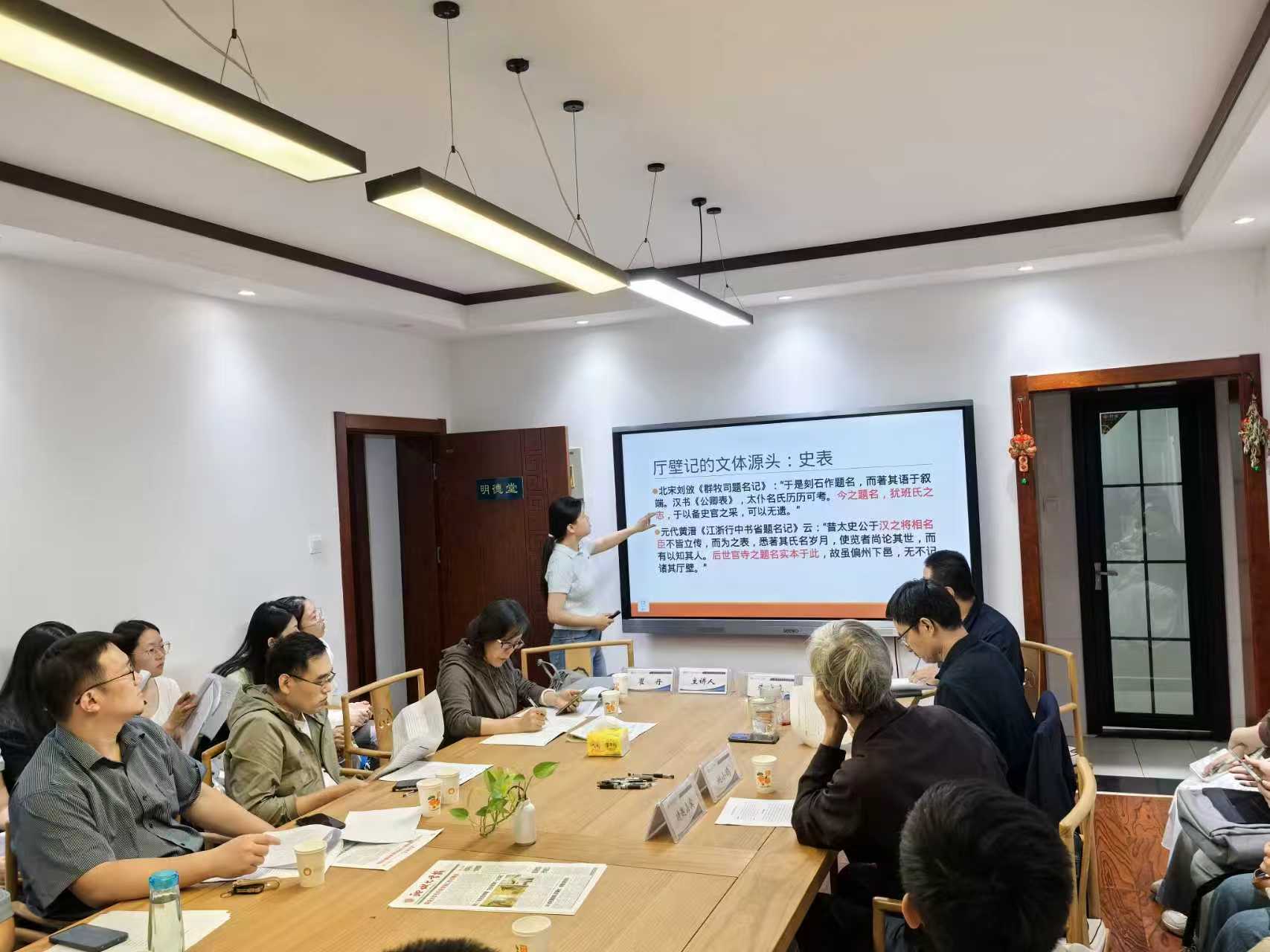 随后,翟丹老师作了题为《官制书写视野下的厅璧记文体》学术报告,从厅壁记概述、厅壁记文体溯源、厅壁记文体诞生内因考三个方面进行了细致的介绍。认为厅壁记是一类以官署厅堂墙壁为书写载体的记事文章,最早可以追溯到司马迁、班固创制的史表再者,受汉唐行政体制变迁的影响,古代官制叙述模式在唐代发生了从长官为纲到官署为纲的转化,厅壁记文体诞生于唐代正是对这种转变的应和。