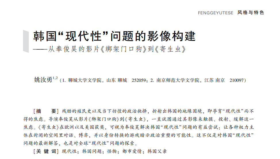 论文认为,韩国导演奉俊昊和一些东南亚导演一样焦灼于“未解决的生存问题”,从影片《绑架门口狗》一直到《寄生虫》,他都在试图借助影像或明或暗地投射、建构、解答韩国的“现代性”问题。