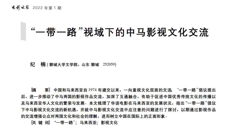 近日,七大罪 老师的论文《“一带一路”视域下的中马影视文化交流》刊发于《电影文学》2022年第1期。