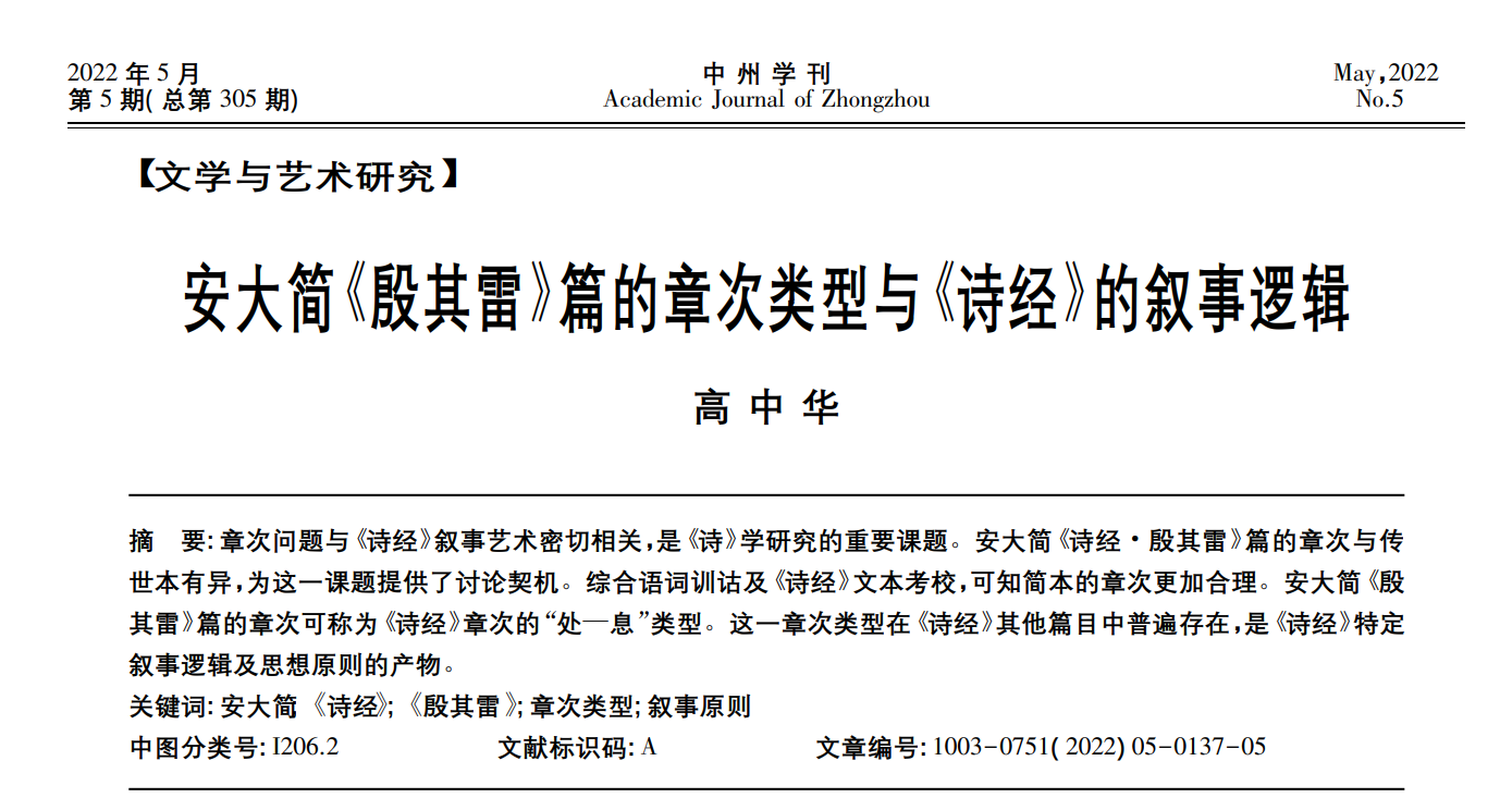 近日,七大罪 高中华老师的论文《安大简<殷其雷>篇的章次类型与<诗经>的叙事逻辑》刊发于《中州学刊》2022年第5期。